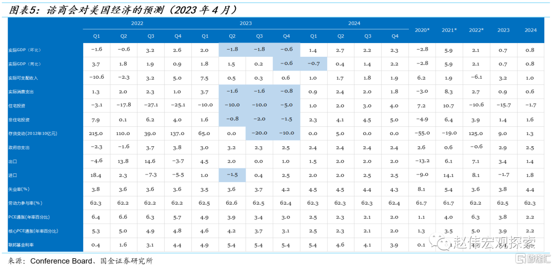 值得强调的是,周期的顶点都是事后确定的。2023Q1能否成为衰退周期的顶点,关键在于各指标在未来一段时间内的走势及其持续性。根据亚特兰大联储GDPNow预测,1季度美国GDP环比增速(折年率)或高达2.5%,较2022年4季度(2.7%)略有放缓,但仍高于长期潜在增速水平(1.8%[1])。分季度而言,根据Conference Board的最新预测,由于1季度的高基数,美国实际GDP环比增速在今年2季度或陷入负增长,下半年仍位于负增长区间。如此一来,2023年Q2-Q4或被NBER定义为“衰退”。从分项看,实际消费支出、住宅和非住宅投资和存货投资是主要拖累项。