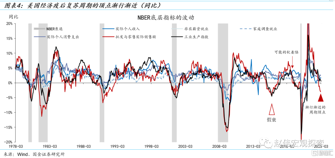 美国经济周期的“坐标”:或已处在从放缓到衰退的“十字路口”,疫后复苏周期的顶点渐行渐近。NBER周期顶点的特征是:6个底层指标中至少有3个出现高点,且持续下行一段时间(一般不少于6个月)。截止到2月,NBER周期分析框架中的6个指标中已有4个指标出现了回撤:非农薪资就业(-0.1%)、实际个人消费支出(-0.1%)、批发与零售实际销售额(-3.7%)和工业生产指数(-1.4%)。3月非农薪资就业继续创新高。所以,只能说顶点渐行渐近。