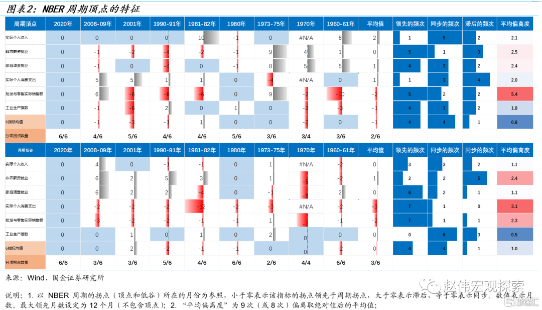 美国经济周期当前处于哪个阶段?在《美国经济能否逃逸“衰退”》中,我们归纳了NBER周期顶点(Peak)特征:第一,6个底层指标至少有3个出现高点,并且持续下行一段时间(一般不少于6个月);第二,批发与零售实际销售额和工业生产指数对周期拐点较为敏感,且具有一定的领先性,平均领先分别为2个月和1个月;第三,工业生产指数的平均偏离度最小(1.8个月),是最佳同步指标。