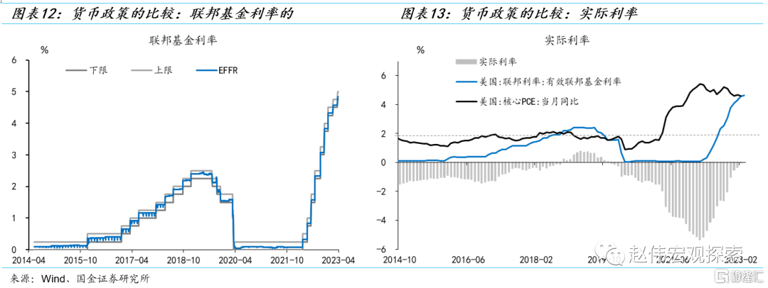 第二,美联储货币紧缩周期的阶段不同:2015-2016年为紧缩初期,2023年为紧缩尾声。2013年12月-2014年10月,美联储完成缩减资产购买计划(Taper),不再继续扩表,酝酿首次加息。2015年12月首次加息,表明货币政策进入紧缩周期。但在国际经济不确定性增加时,美联储放缓了加息的节奏,直到经济企稳,2016年12月才第二次加息,并在2017年-2018年加快加息节奏(分别为3次和4次)。从实际利率的角度看,2015-2016年仍处在实际负利率时期,货币政策立场是偏宽松的。反之,2023年货币政策已进入紧缩尾声,名义EFFR远高于2015-2016年,实际利率已接近转正,后续还将上行。
