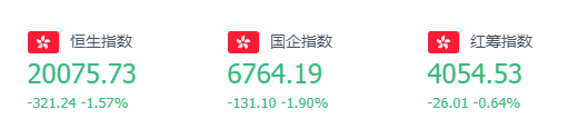恒生指数上周跌1.78%,报20075.73点;国企指数上周跌2.17%,报6764.19点;恒生科技指数上周跌4.66%,报3969.94点。