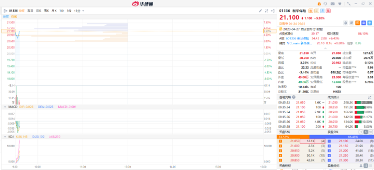 新华保险早盘高开逾5%,截止发稿,涨5.5%,报21.10港元。