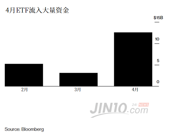 4月份,超过126亿美元流入美股交易型开放式指数基金(ETF),达1月以来的最大涌入规模,比2月和3月的流入资金还翻了一番。数据显示,资金涌入股票的速度与投资者逃离现金的速度一样快:超短期限ETF有望出现1月以来的首次月度资金流出。