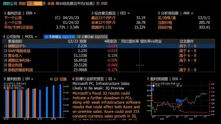 微软财年为每年的7月1日至第二年的6月30日,最新披露财报所属2023财年第三财季(1月-3月),将于4月25日美股盘后公布。据彭博分析师预计,微软2023财年第三财季营收为511.33亿美元,调整后净利润为166.91亿美元,调整后每股收益为2.235美元。