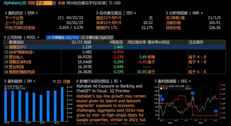 谷歌将于4月25日盘后公布2023财年一季报。彭博预期,谷歌2023年Q1将实现营收569.32亿美元,同比增长1.6%;调整后净利润为155.46亿美元,同比下滑5.4%;调整后每股收益为1.08美元。