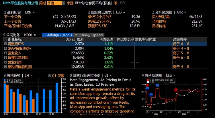 Meta将于4月26日美股盘后公布2023财年一季报,彭博分析师预计该季度Meta营收为276.58亿美元,调整后净利润为54.69亿美元,调整后每股收益为2.004美元。