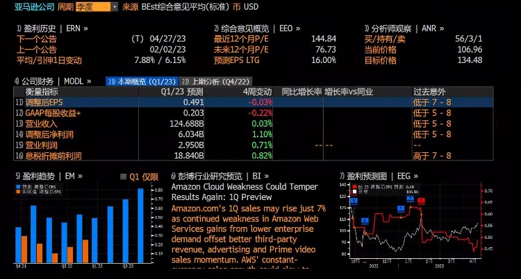 亚马逊将于4月27日盘后公布2023财年一季报,彭博预计一季度亚马逊营收为1246.88亿美元,调整后净利润为60.34亿美元,调整后每股收益为0.203美元。