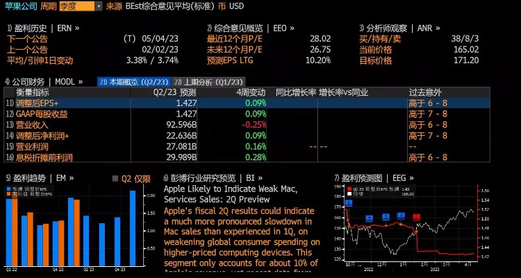 苹果财年为每年的10月1日至第二年的9月30日,最新财报季披露的是2023财年二季报,将于5月4日盘后公布。彭博预计,2023财年Q2,苹果营业收入为925.96亿美元,调整后净利润为226.36亿美元,调整后每股收益为1.427美元。