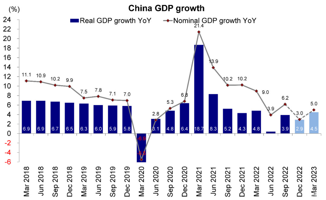 图表:2023年1季度中国GDP增速好于市场预期