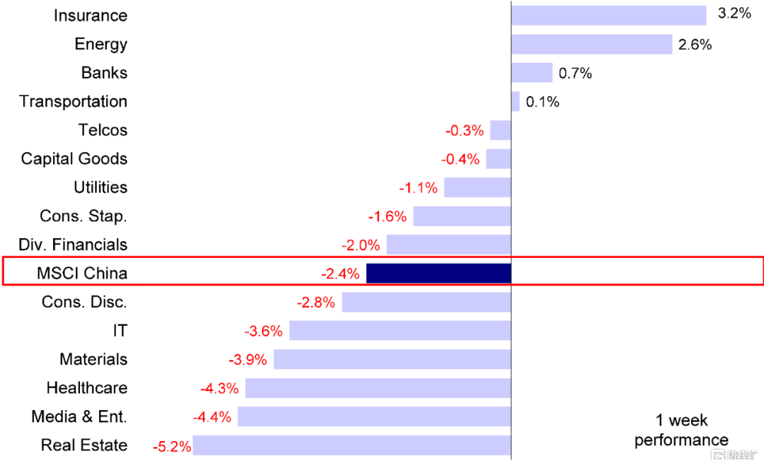图表:MSCI中国指数上周回落2.4%,其中地产板块表现落后