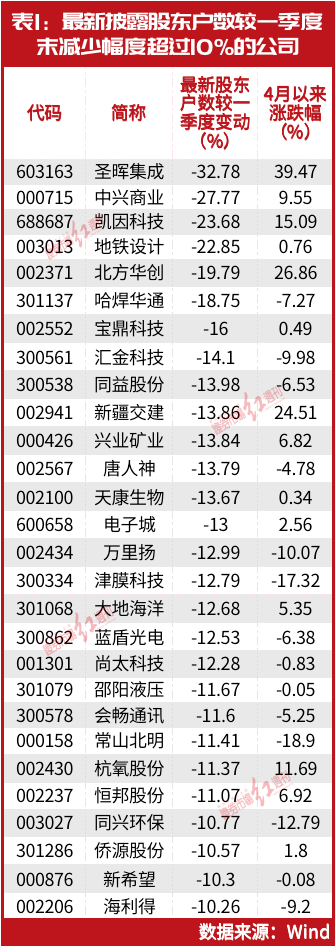 整体来看,二季度更新股东户数最新变动情况的公司中,28家相较一季度末股东已缩减超过10%(见表1)。且观察发现,此类公司中也不乏有知名投资人早已参与其中。如杭氧股份,2022年四季度末,由朱少醒管理的富国天惠精选成长混合基金以500万股的持仓位居公司第十大股东。但今年一季度是否仍继续持有尚不得而知。