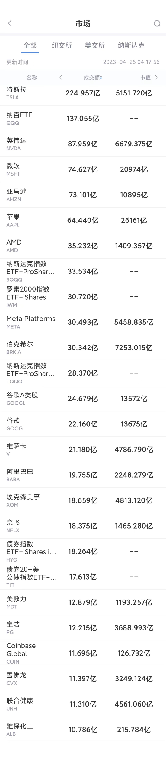 第3名微软收跌1.4%,成交74.6亿美元。微软将在本周公布财报。