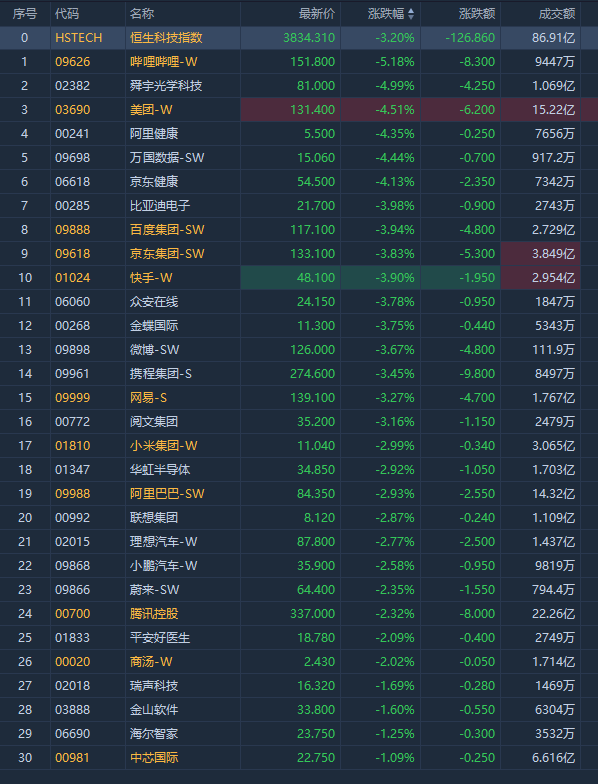 科网股纷纷走弱,哔哩哔哩-W跌超5%,美团-W跌超4%,京东集团-SW、百度集团-SW、快手-W均跌超3%;商汤-W、阿里巴巴-SW、腾讯控股跟跌。