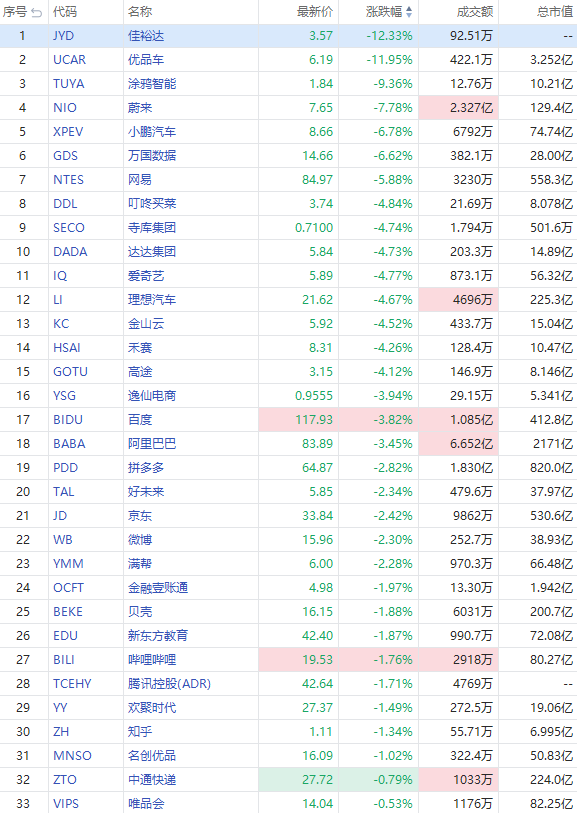 盘面上, 佳裕达跌12.33%报3.57美元每股,股价破发后再创新低;优品车重挫近12%。新能源汽车股蔚来跌7.78%报7.65美元每股,成交额2.32亿美元,小鹏汽车跌逾6%,理想汽车跟跌4%。
