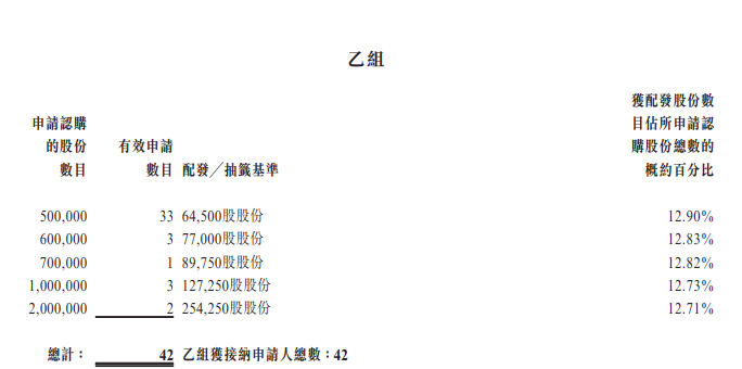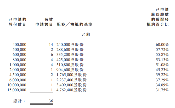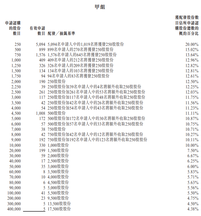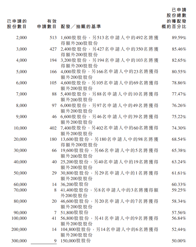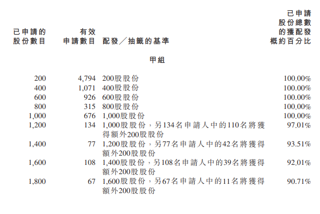 香港发售项下初步提呈发售的香港发售股份获大幅超额认购。合共收到11529份有效申请,认购合共6577.925万股香港发售股份,相当于香港公开发售项下初步可供认购的香港发售股份总数667.9万股的约9.85倍.