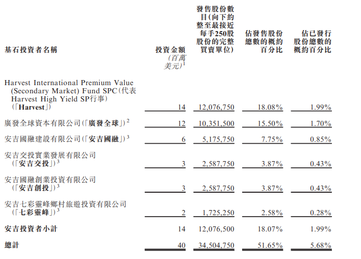基石投资者已认购34504.75万股发售股份,相当于发售股份总数的约51.65%及紧随全球发售完成后已发行股份的约5.68%。