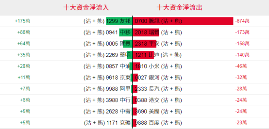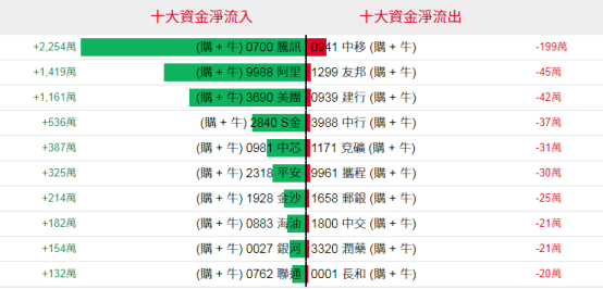 淡仓(认沽证及熊证)方面,周二友邦、中移动、汇丰等相关淡仓录部分资金净流入; 腾讯控股、瑞声科技、中国平安、比亚迪股份等相关淡仓则均录部分资金净流出套现。