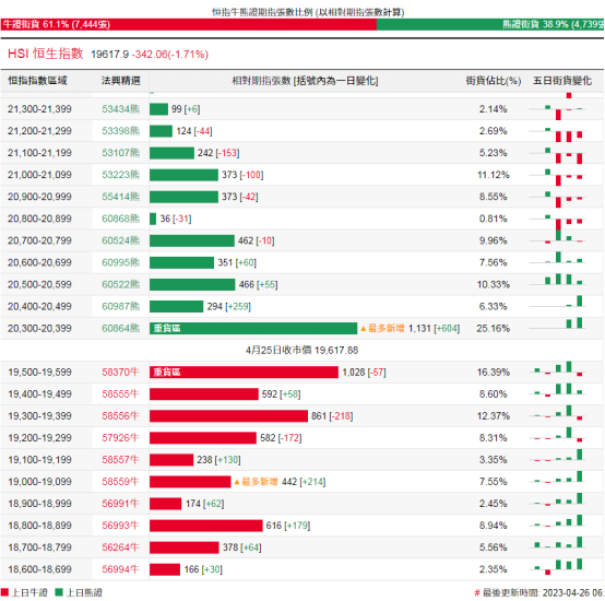 街货分布方面,至周二,恒指牛证街货在收回价19000点至10600点之间,累计街货相当约3743张期指合约; 恒指熊证街货在收回价20300点至20800点之间,累计相当约2704张期指合约。