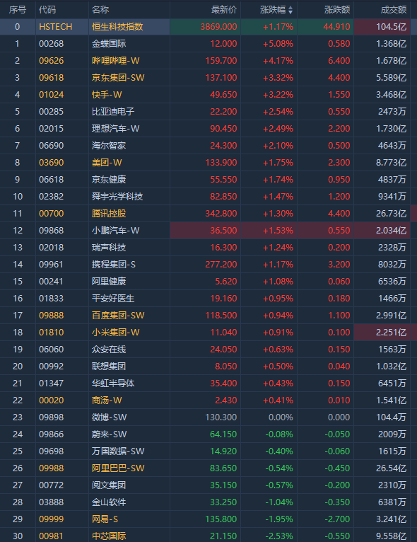 此外,金蝶国际现涨超5%,富瑞给予买入评级目标价20.24港元;网易-S跌近2%,暴雪拒付国服玩家退款相关费用 网易起诉暴雪欠款3亿。