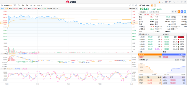 截止美股收盘,谷歌跌2.03%报104.61美元,最新总市值13308.6亿美元。不过在业绩公布后,盘后股价一度大涨近5%。