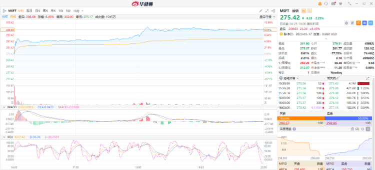 截止美股收盘,微软跌2.25%报275.42美元,最新总市值20501.7亿美元。不过在业绩公布后,盘后股价一度大涨超9%。