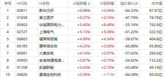 截至发稿,新华文轩A股涨9.98%,H股现涨3.64%,春立医疗A股涨9.27%,H股现涨3.74%,华能国际电力股份A股涨5.4%,H股现涨8.48%。