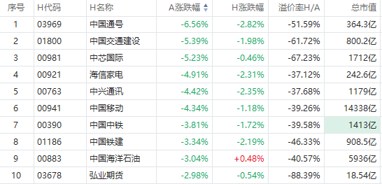 中国通号A股跌6.56%,H股现跌2.82%,中国交通建设A股跌5.39%,H股现跌1.98%,中芯国际A股跌5.23%,H股现跌0.46%。