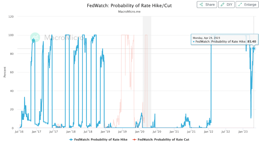 同时,在最新调查的105位经济学家中,近90%(94位)预测美联储将在5月的议息会议上将加息25个基点。无论是投资者还是经济学家,对于美联储5月议息会议再加息25个基点已经形成了一致预期。