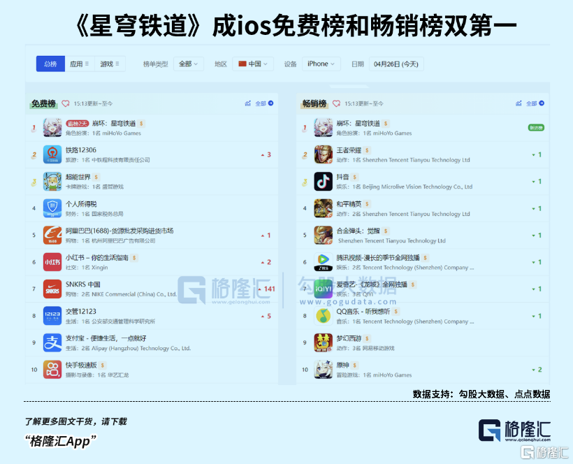 战绩说明一切,今日开服后仅5个小时,《星穹铁道》就超越《王者荣耀》,成为ios免费榜和畅销榜双第一。