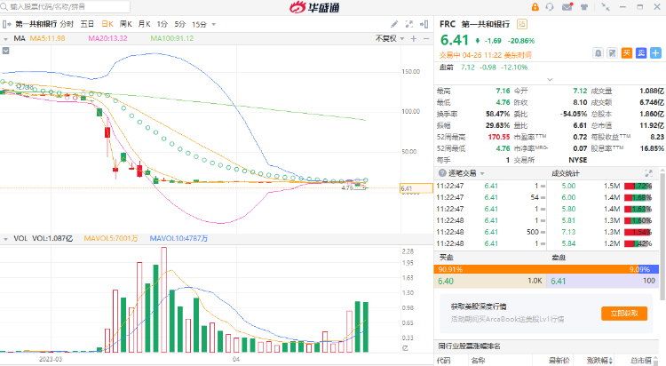 美东时间周三,第一共和银行开盘跌约11%,但有消息称美国政府目前不愿对其采取干预措施后,股价快速走低,跌幅扩大至近20%。