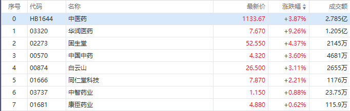 中医药概念股涨幅居前,截至发稿,华润医药涨超9%;固生堂涨超4%;中国中药、白云山涨超3%;同仁堂科技涨超2%。