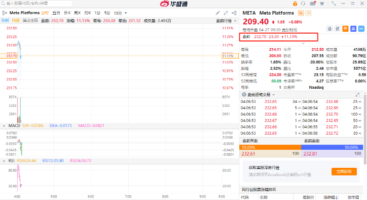 Meta Platforms美股盘前涨11%,Q1营收同比增长3%至286.5亿美元。微软美股盘前微涨0.33%,第三财季净利润同超预期。