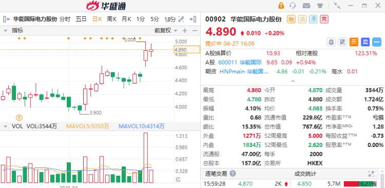 - 华能国际电力股份发布的最新一季报显示,第一财季公司盈利22.5亿元同比暴增335.3%,上年同期亏损9.56亿元,扭亏为盈;总营收652.69亿元,同比增长0.03%。