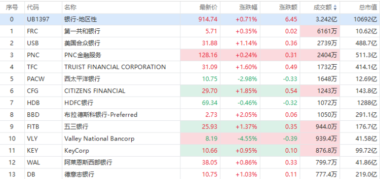 银行股方面,第一共和银行微涨0.35%报5.71美元,该股隔夜暴跌近30%创股价新低,美国合众银行、德意志银行涨超1%;巴克莱银行涨近5%,Q1营收、净利润均超市场预期。
