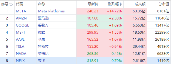 华盛资讯4月27日消息,明星科技股多数走强,Meta涨14.72%报240.23美元每股,成交额53亿美元,公司业绩超预期;亚马逊涨2.5%,宣布将进行新一轮裁员,公司盘后公布业绩。苹果、微软、谷歌A涨超1%,特斯拉升0.94%报155.2美元,英伟达、奈飞微跌。