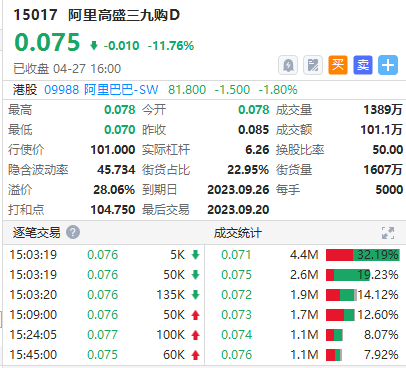 阿里沽11850,行使价77.83元,2023年06月27日到期,实际杠杆7.5倍,低面值