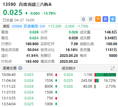 百度购13590,行使价160.98元,2023年08月28日到期,实际杠杆7.5倍,低面值