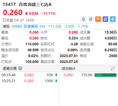 百度沽15417,行使价118.08元,2023年07月31日到期,实际杠杆4.2倍,贴价、低街货