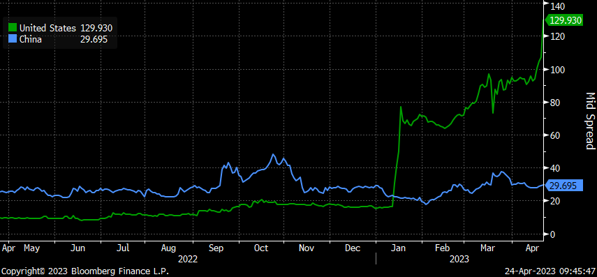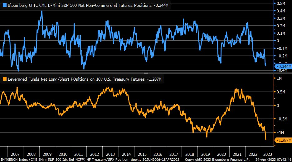 从下图可以看到,不仅是股票空头头寸,美债空头头寸也处于历史最高水平,这是因为债务上限僵局连同第一共和银行惨淡的季度报告引发了一些不安情绪。
