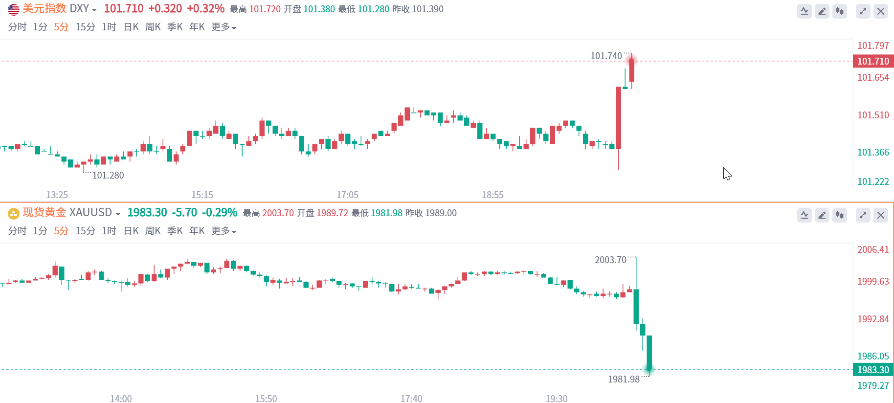 数据公布后,现货黄金持续下挫,向下逼近1980关口。美元指数短线走高近40点;非美货币普遍走低,美元兑日元短线走高70点。