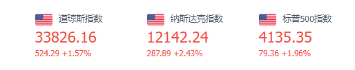 美股周四收高,道指创1月份以来的最大单日涨幅。纳指涨幅为2.43%,报12142.24点;标普500指数涨幅为1.96%,报4135.35点。Meta绩后上涨13.9%,特斯拉收高4.19%,亚马逊收高4.61%,阿里巴巴收高1.99%。