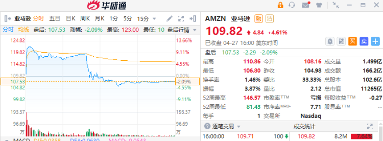 亚马逊第一季度营收和每股摊薄收益均超出华尔街分析师预期,并且该公司对第二季度营收作出的展望也同样超出预期,公司盘后股价盘后涨超13%后转跌。公司第一季度净销售额为1273.58亿美元,与上年同期的1164.44亿美元相比增长9%,不计入汇率变动的影响为同比增长11%;净利润为31.72亿美元,上年同期的净亏损为38.44亿美元。
