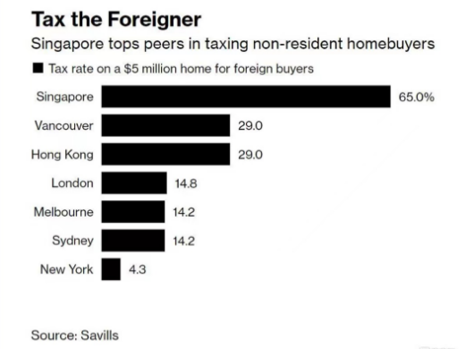 新加坡是全球主要市场中对外国买家征收最高房产税的国家,周四新加坡房产税翻了一番至65%。据第一太平戴维斯公司的数据,现在外国人在新加坡买房要支付60%的额外买家印花税,这意味着该城市的征税额度远远超过了其他国际中心城市,包括温哥华(29%)、香港(29%)、伦敦(14.8%)和纽约(4.3%)。