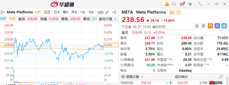 科技股表现强劲,Meta Platforms季度业绩超出分析师预期,提振纳指上涨2.4%,股价涨近14%;亚马逊盘后公布一季度业绩,营收也高于预期,盘后股价涨超13%后转跌。