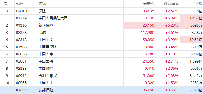 多家险企放榜一季度业绩,净利润均录得同比上扬,早盘股价普遍上行,新华保险、中国人民保险集团涨超5%,保诚涨超4%,中国平安、中国人寿,中国太保涨超3%,友邦保险跟涨。