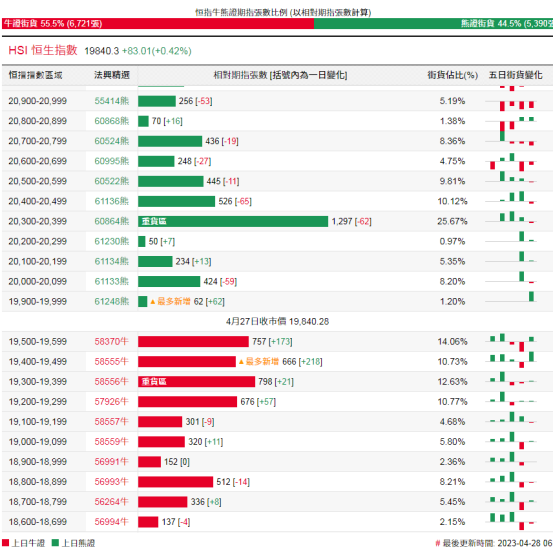 街货分布方面,至周四,恒指牛证街货集中在收回价19200点至19600点之间,累计相当约2897张期指合约; 恒指熊证街货集中在收回价20300点至20800点之间,累计相当约2952张期指合约。