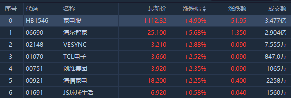 华盛资讯4月28日讯,港股家电股午盘集体上涨,海尔智家(06690)上涨5.68%,报25.10港元;VESYNC(02148)上涨2.88%,报3.21港元;TCL电子(01070)上涨2.52%,报3.66港元;创维集团(00751)上涨2.35%,报3.92港元;海信家电(00921)上涨2.25%,报18.2港元。