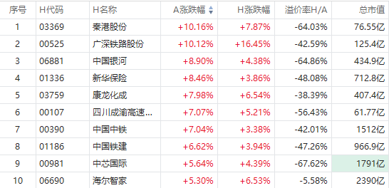 截至发稿,秦港股份A股涨10.16%,H股现涨7.87%,广深铁路股份A股涨10.12%,H股现涨16.45%,中国银河A股涨8.9%,H股现涨4.38%,中芯国际A股涨5.64%,H股现涨4.39%。