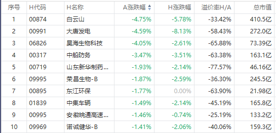 白云山A股跌4.75%,H股现跌5.78%,大唐发电A股跌4.59%,H股现跌8.13%,昊海生物科技A股跌4.05%,H股现跌2.61%。