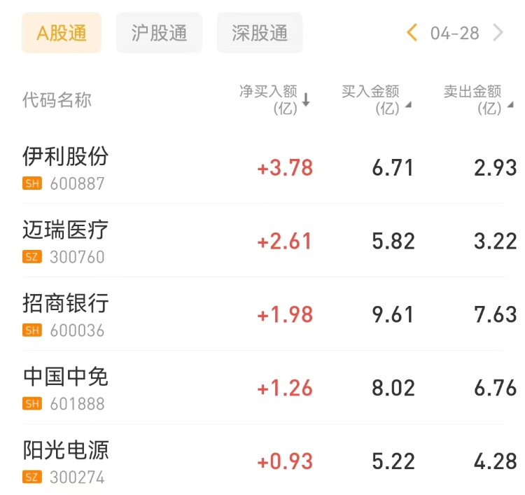 北向资金净买入15.85亿元,伊利股份获净买入3.78亿元,迈瑞医疗获净买入2.61亿元;比亚迪获净卖出3.12亿元,科大讯飞获净卖出2.81亿元。